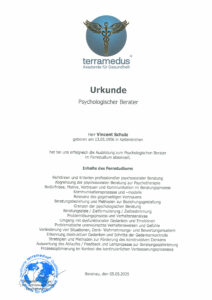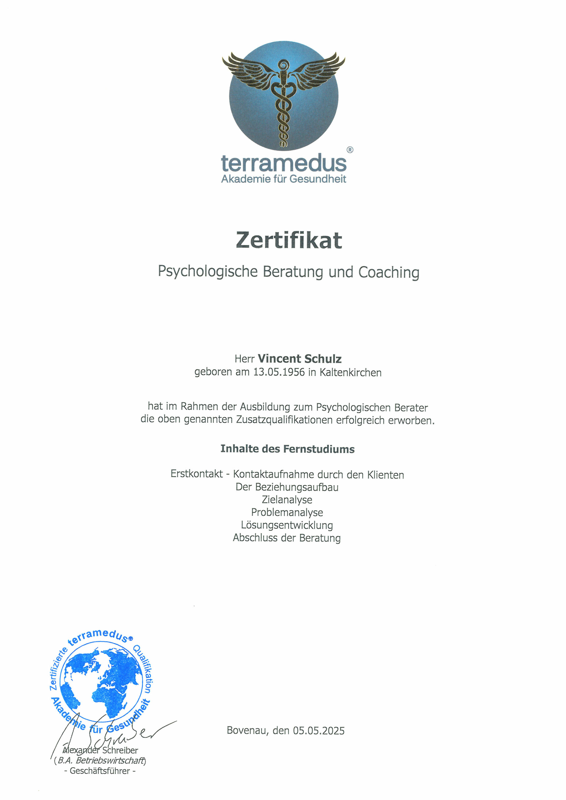 In Kiel habe ich Lehramt studiert, im Anschluss Kaufmann gelernt und in diesem Beruf über 40 Jahre gearbeitet, als Geschäftsführer in mittelständischen Unternehmen habe ich unzählige Personalgespräche geführt, in denen ich als guter Zuhörer, Berater und Mediator gewirkt habe. Im privaten Bereich habe ich als Familienvater während meiner dreißigjährigen ersten Ehe viele Jahre bei verschiedenen Therapeuten in Einzel und Paartherapie an meiner persönlichen Entwicklung gearbeitet, an Familienaufstellungen und Atemworkshops teilgenommen und eine Ausbildung zum Psychologischen Berater abgeschlossen.